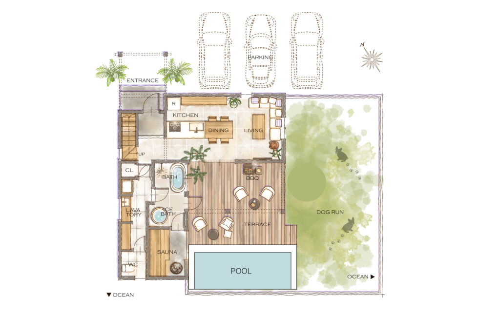広々としたウッドデッキのテラスは海の目の前。心地よい海風と波の音に癒されながらのサウナ後の外気浴はもう格別です。ウッドデッキにはBBQコンロも設置しており、地元の食材で贅沢なBBQも楽しむことができます。ジャグジーもあり、寒い時期でもテラスで楽しむことができます。